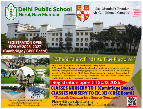 Delhi Public School, Navi Mumbai under the aegis of the DPS Society stands nestled in the beautiful sylvan environs of Nerul, Navi Mumbai surrounded on two sides by the glistening waters of two lakes.